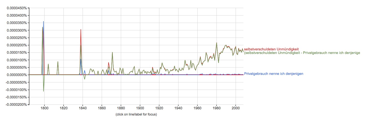 Since it may be easier to make sense of this by actually looking at the Ngram itself (where Google gives you the ability to highlight different lines on the graph), it would be worth opening this link in a separate window and playing around with it as you read what follows (obviously, this is easier if you have a really big monitor). The green line shows us the result for all of the uses of “selbstverschuldeten Unmündigkeit” that occur in texts that do not also include the phrase “Privatgebrauch nenne ich denjenigen.” It is my suspicion that this provides us with discussions of Kant’s essay, as opposed to editions of Kant’s essay. One way of appreciating the differences between editions and discussions is to go to the Ngram itself and move the cursor between the graph for “selbstverschuldeten Unmündigkeit” and the one for “selbstverschuldeten Unmündigkeit – Privatgebrauch nenne ich denjenigen.” Notice how the subtraction of the term dampens the peaks at 1799 and 1840? What is being eliminated here are Kant editions.