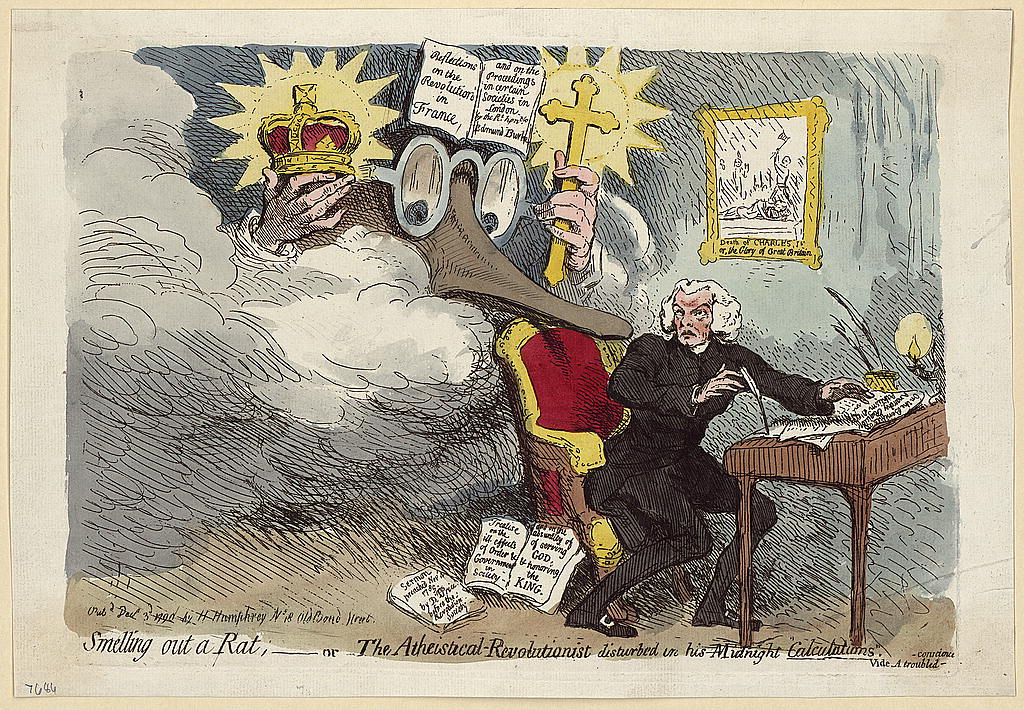 While even weak Gillray is better than practically anyone else, there is a considerably more skilled use of some of these same tropes in Smelling Out a Rat, Gillray’s contribution to the war of prints that greeted Edmund Burke’s Reflections on the Revolution in France.