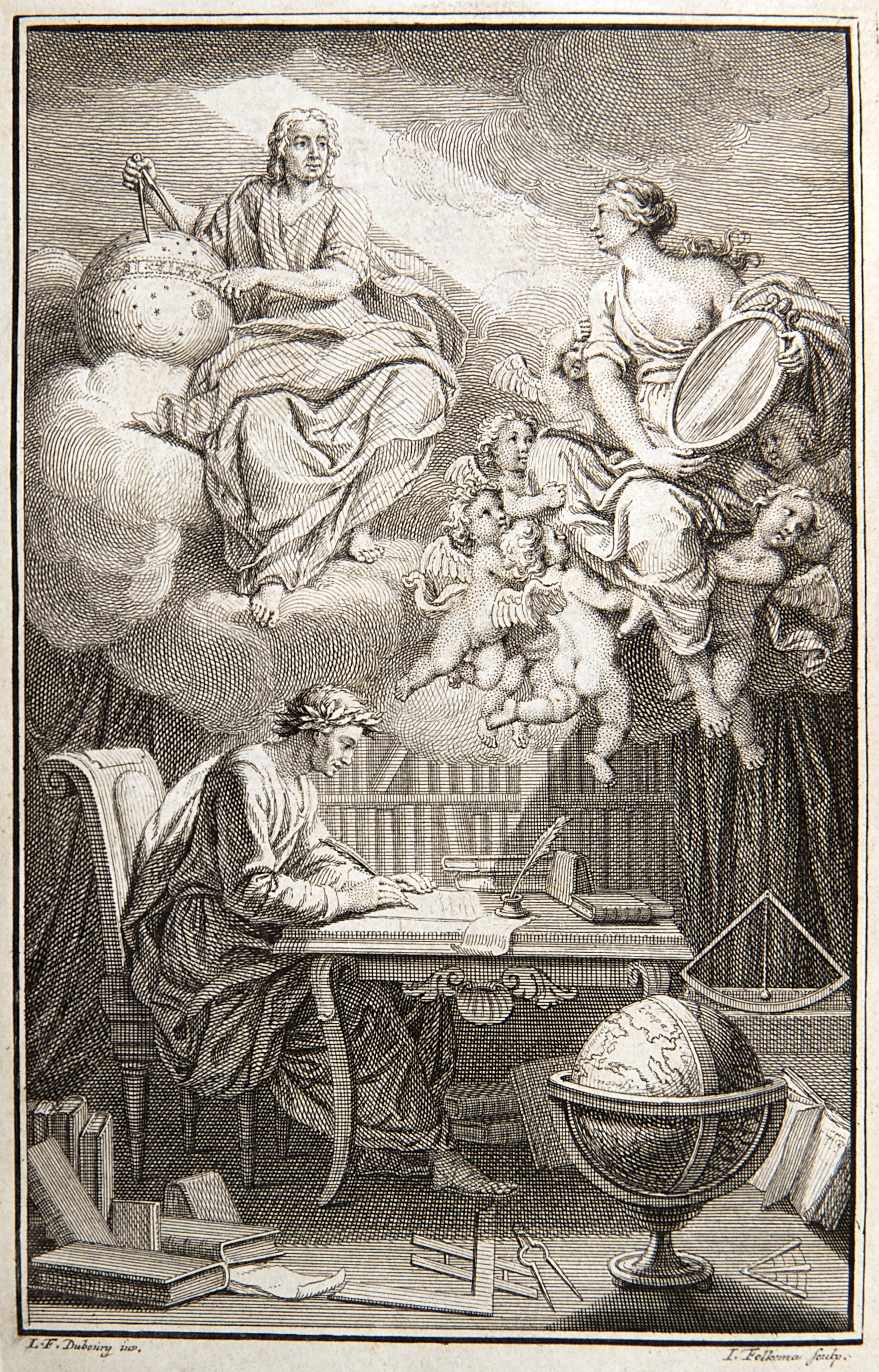 We see something similar in the frontispiece to Voltaire’s Elements of the Philosophy of Newton (1738).  Light streams over his left shoulder from an opening in the clouds above and is reflected in mirror held by a woman (Truth, again, I suppose, though now in the more earthly guise of the brilliant mathematician Gabrille Emilie du Châtelet) down onto the writing table where an idealized image of Voltaire, her student and lover is hard at work.