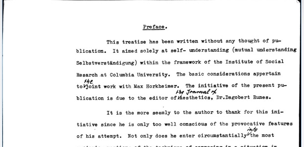 It is unclear when Adorno submitted the manuscript of his “Philosophy of Advanced Music” to the JAAC, though it appears that he did so with Runes’ encouragement. The manuscript begins with a “Preface” — dated “September 1941” and not contained in the original German manuscript — that explains