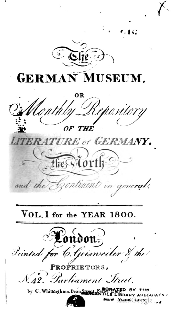 - For what follows, I am indebted to two articles by Barry Murnane, “Radical Translations: Dubious Anglo-German Cultural Transfers in the 1790s,” in (Re-) Writing the Radical: Enlightenment, Revolution and Cultural Transfer in 1790s Germany, Britain and France, ed. Maike Oergel, Spectrum Literaturwissenschaft/spectrum Literature 32 (Berlin: De Gruyter, 2012), 44–60 and “Gothic Translation: Germany, 1760-1830,” in The Gothic World, ed. Glennis Byron and Dale Townshend, Routledge Worlds (Abingdon: Routledge, 2013), 231–42 and to the discussion in John R. Davis, The Victorians and Germany (Lang 2007) 54. There is a passing discussion of the German Museum and of Peter Will on p. 62 of Rudolf Muhs’ article “Geisteswehen: Rahmenbedingungen Des Deutsch-Britischen Kulturaustauschs Im 19. Jahrhundert” in R. Murhs, J. Paulmann, W. Steinmetz, eds. Aneignung und Abwehr. Interkultureller Transfer zwischen Deutschland und Grossbritannien im 19. Jahrhundert (Bodenheim, 1998) 44-70. ↩
