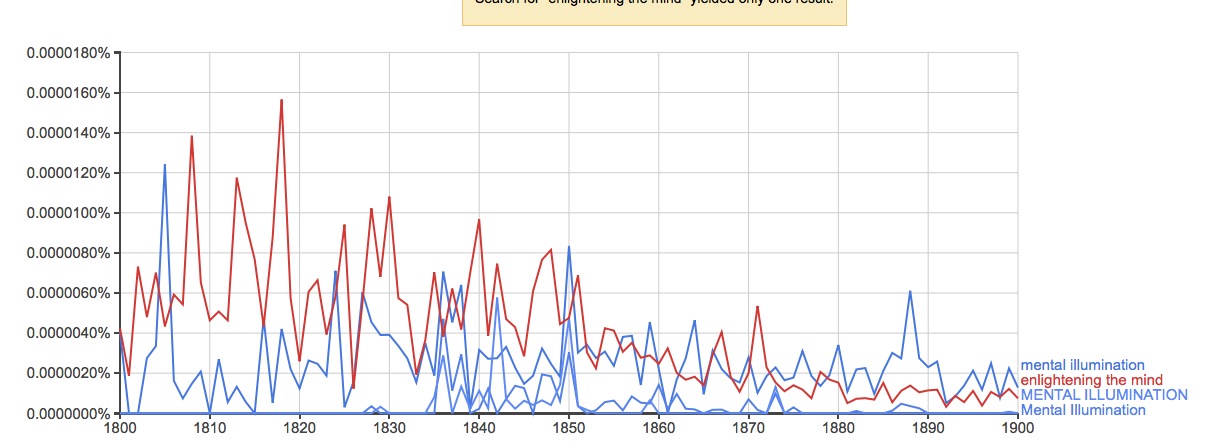 While Aufklärung would have presented greater problems in 1800, it is clear that the German Museum had a convention for translating it: “mental illumination.” A review of C. D. Vosz’s Das Jahrhundert der Aufklärung in the first volume referred to the book as “The Age of Mental Illumination” (I:435-436) and Georg Joachim Zollikofer’s “Der werth der grössern Aufklärung der Menschens” was translated as “An Estimation of the Advantages arising from the Program of Mental Illumination” (I: 396-403). A quick check of Volume II (the one volume that, to date, I have processed using OCR software) yields eight occurrences of the phrase “mental illumination” but none of “enlightenment” or “Enlightenment.”6 In contrast, “enlightening” used quite frequently (a total of twelve times, two of which occur in the text of the translation of the Mendelssohn essay). “To enlighten” occurs four times (“to enlighten the understanding of the multitude” (3), “to enlighten a whole nation by facts” (321), “a school to enlighten us” (343), and “endeavors to enlighten the nations” (477)). The translator strayed from the convention only slightly, preceding the words “enlightening the mind” with “intellectual improvement.”