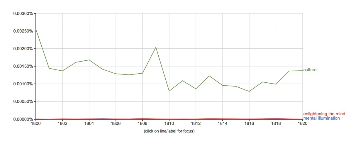 This Ngram, even more than is usually the case, leaves us with more questions than answers. Among the more important is the question of how many of the uses of Bildung and of Aufklärung over this period are simply discussions of education in the more specific sense that is typically associated with the term Erziehung? But that question, however important, is not the one that concerns me here. My interest lies with X’s decision to translate Bildung as “Civilization.”
