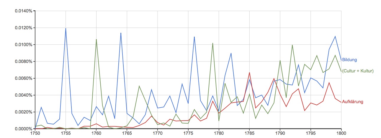 That Mendelssohn regarded Bildung — despite this rich and complicated history — as a new-comer might have had something to do with the publication, a decade earlier, of Herder’s Auch eine Philosophie der Geschichte zur Bildung der Menschheit (1774). Ngrams for eighteenth-century texts are, of course, probably useless (if only because the sample of eighteenth-century that would have been sitting on library shelves when Google did its scanning can hardly have been representative of the corpus of texts published during the period) and the problems are even greater in the case of eighteenth-century German texts (e.g., what sorts of texts would North American and English libraries be collecting?). But it is, I suppose, of some interest that, among these alleged newcomers, Aufklärung seems to have been the last to catch on, with a slow ascent beginning in the middle of the 1760s and a sudden uptick around the time that Zöllner asked his famous question in the Berlinische Monatsschrift.