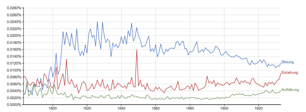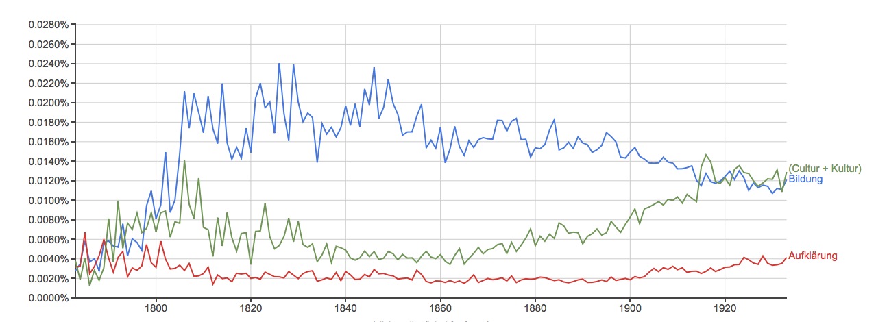 Bildung would seem to be the most successful of Mendelssohn’s three newcomers, with a rapid ascent during the two decades after his essay. Kultur exhibits a somewhat more modest climb, a sudden descent (as Bildung continues its rise), followed by a steady increase from 1860 onward. The lines for Bildung and Kultur join around the time of the cessation of hostilities in 1918. It would, of course, be necessary to spend some time poking around in the snippets to see what is taking place here, especially since a fair number of the occurrences of Bildung are likely to be the result of the emergence of pedagogy as a discipline and discussions of public education. But it bears remembering that Aufklärung, which consistently lags the other two terms also has close connections to pedagogical concerns.